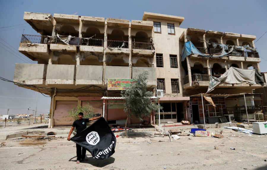 Bağdat Hükümeti güçlerinin bir mensubu, Felluce'de bir binadan indirdiği IŞİD bayrağı ile poz veriyor