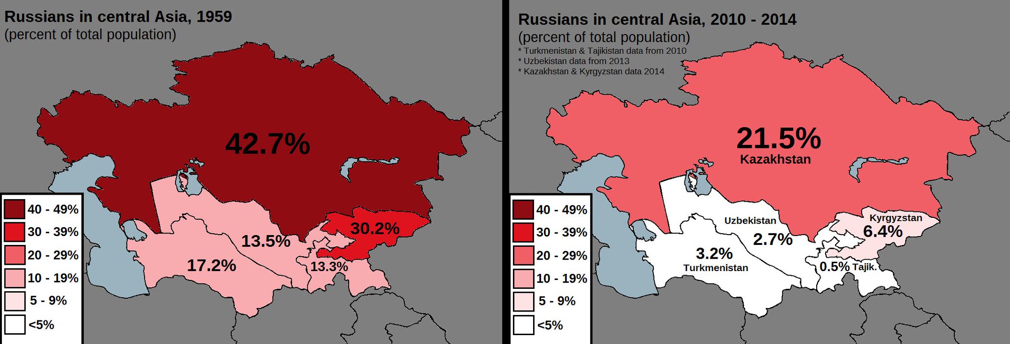 Rus kaynakların yaptığı bir araştırmaya göre, 1959 yılında Kazakistan'daki nüfusun yüzde 42'sini oluşturan Rusların genel nüfusa oranı, 2010 yılı itibariyle yüzde 21'e düşmüş durumda.