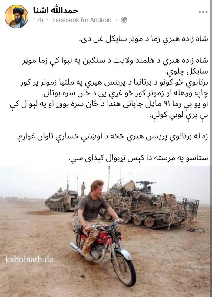 Afganistan'ın güneyindeki Hilmend ilinde yaşayan Hamdullah Aşna, Harry'nin fotoğraflarını paylaşarak, söz konusu fotoğrafların kendi evine düzenlenen bir baskının ardından çekildiğini ifade etti.