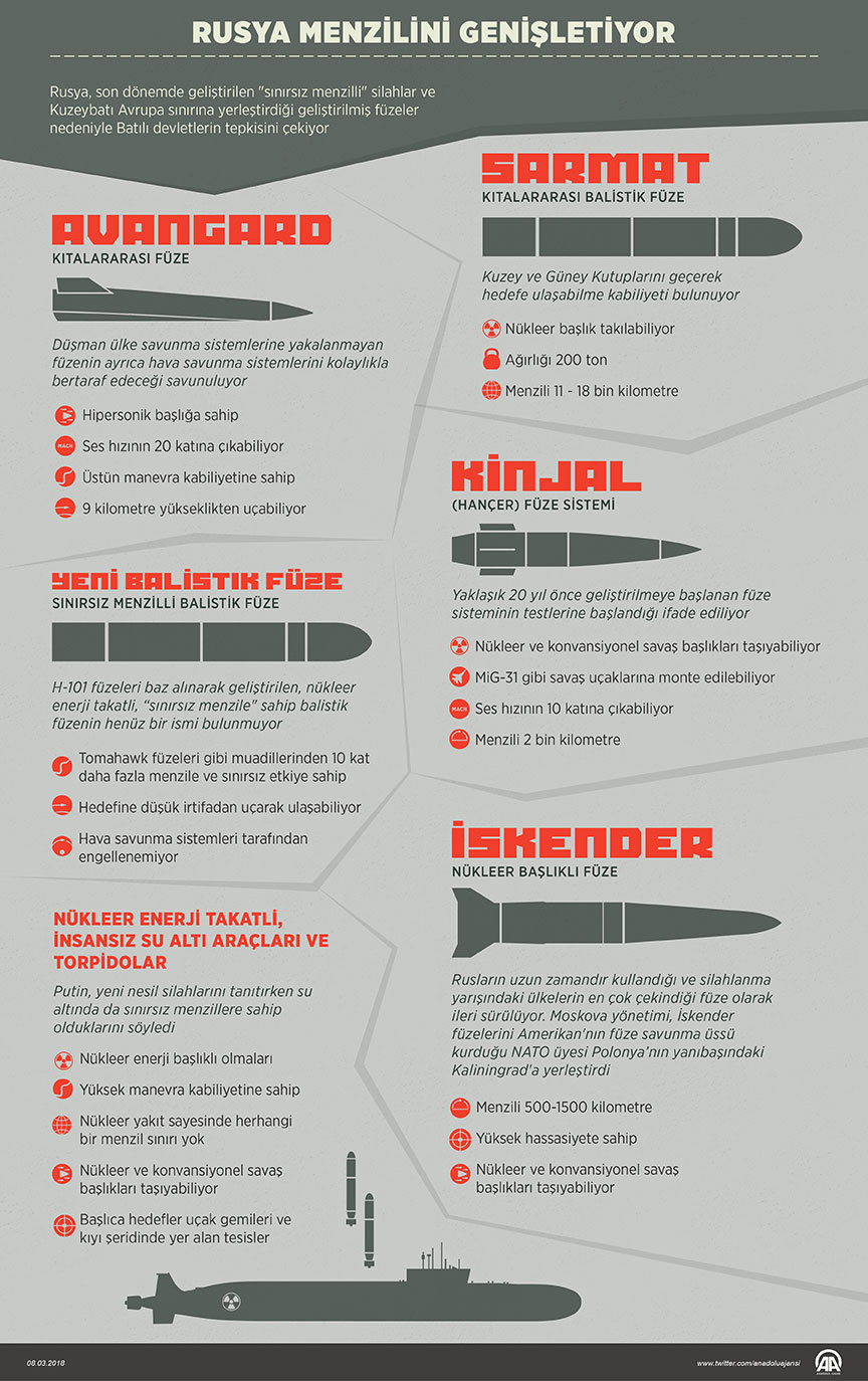Rusya Devlet Başkanı Putin'in "yenilmez" olarak tanımladığı silahlardan, kıtalar arası hipersonik füze sisteminin geliştirilmesinin ve kıtalararası balistik füzenin ise fırlatma testlerinin tamamlandığı bildirildi.