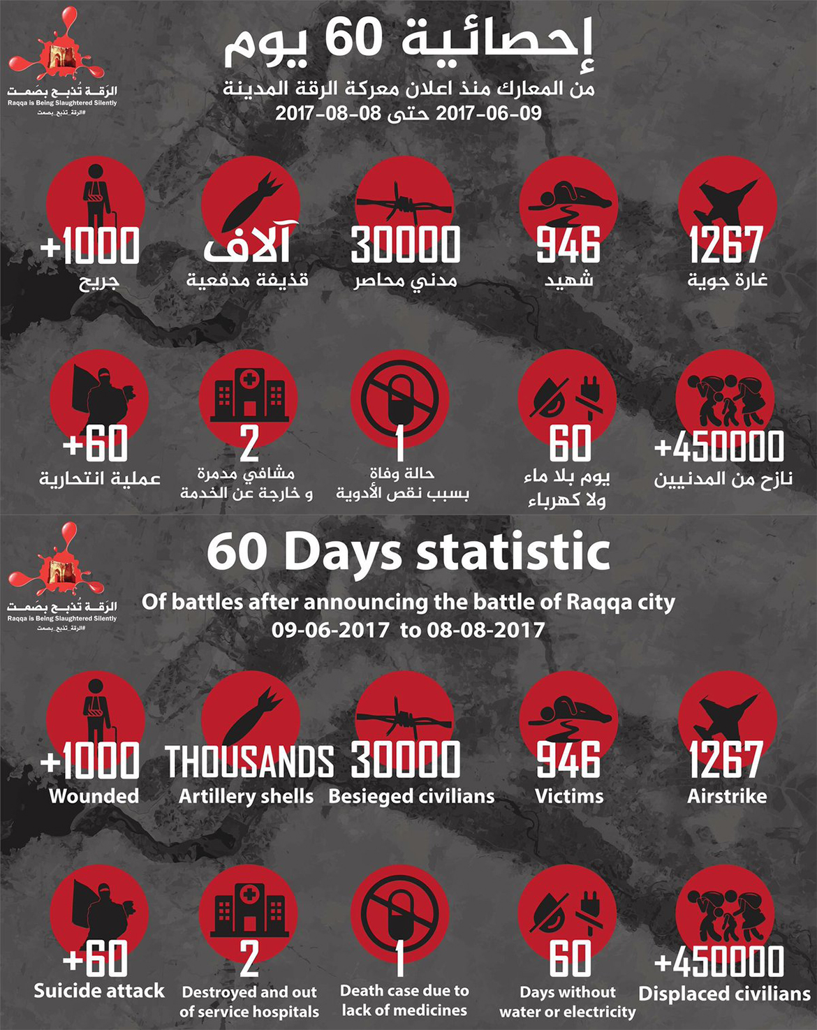 Rakka kentinden haber paylaşımı yapan "Rakka Sessizce Katlediliyor" isimli aktivist grubun paylaştığı verilere göre 60 günlük sürede Rakka kentinde 946 sivil yaşamını yitirdi.