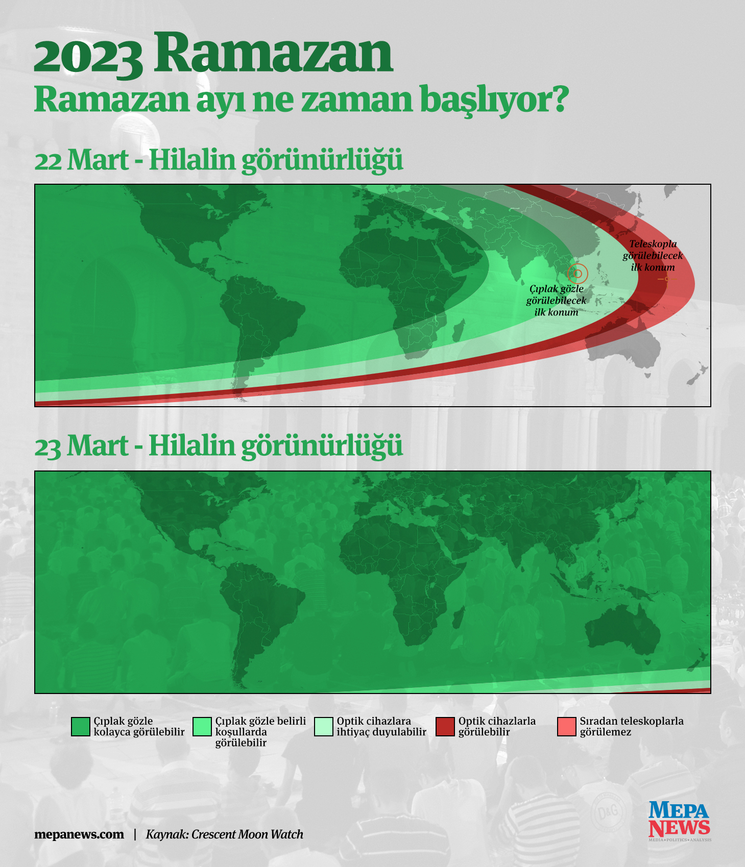 Birçok farklı ülke ve merkezde gerçekleşecek gözlemlerde hilalin görülmesi halinde 22 Mart gecesi ilk teravihler kılınırken, 23 Mart Ramazan ayının ilk günü olacak ve oruç tutulacak.