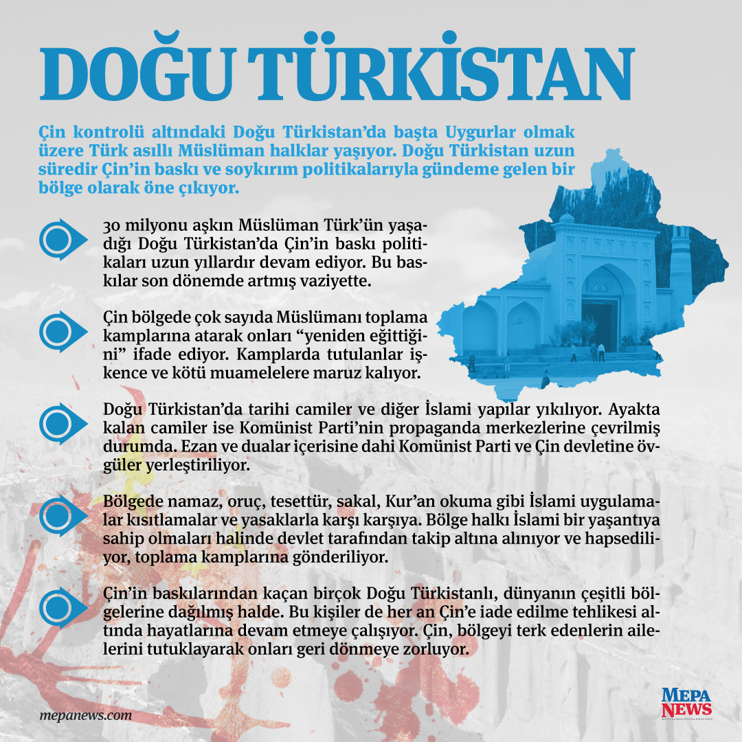 Çin kontrolü altındaki Doğu Türkistan’da başta Uygurlar olmak üzere Türk asıllı Müslüman halklar Pekin yönetiminin baskısı altında yaşıyor.