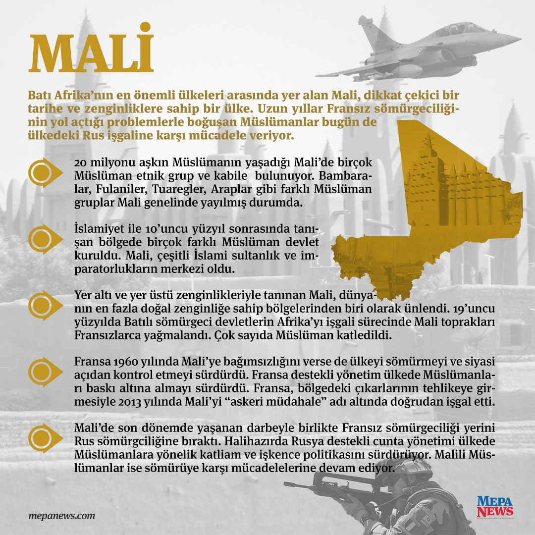 Mali’de son dönemde yaşanan darbeyle birlikte Fransız sömürgeciliği yerini Rus sömürgciliğine bıraktı. Halihazırda Rusya destekli cunta yönetimi ülkede Müslümanlara yönelik katliam ve işkence politikasını sürdürüyor. Malili Müslümanlar ise sömürüye karşı mücadelelerine devam ediyor.