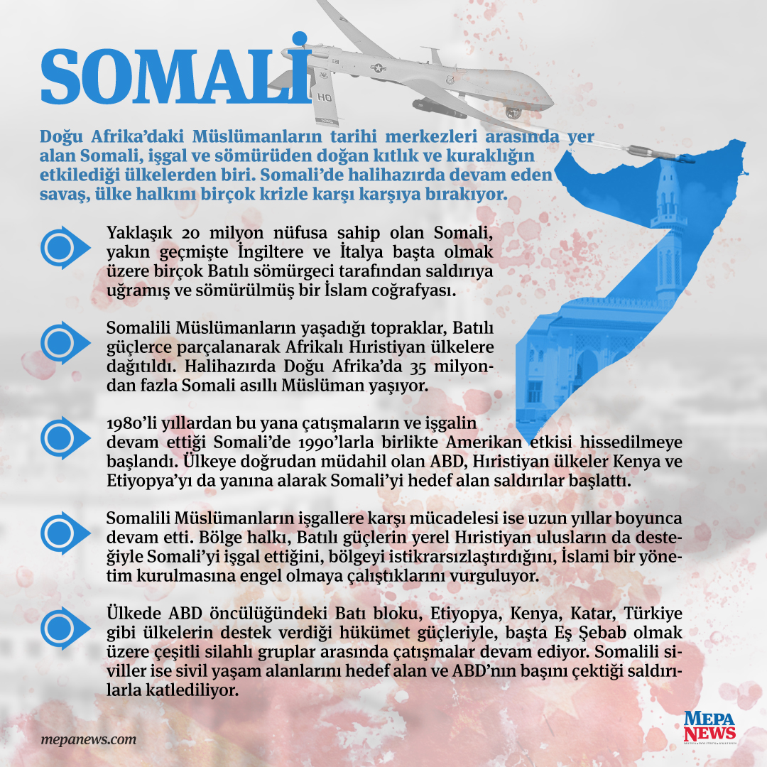 Yaklaşık 20 milyon nüfusa sahip olan Somali, yakın geçmişte İngiltere ve İtalya başta olmak üzere birçok Batılı sömürgeci tarafından saldırıya uğramış ve sömürülmüş bir İslam coğrafyası.