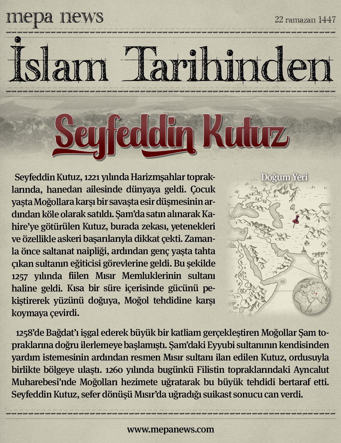 "1260 yılında bugünkü Filistin topraklarındaki Ayncalut Muharebesi’nde Moğolları hezimete uğratarak bu büyük tehdidi bertaraf etti. "