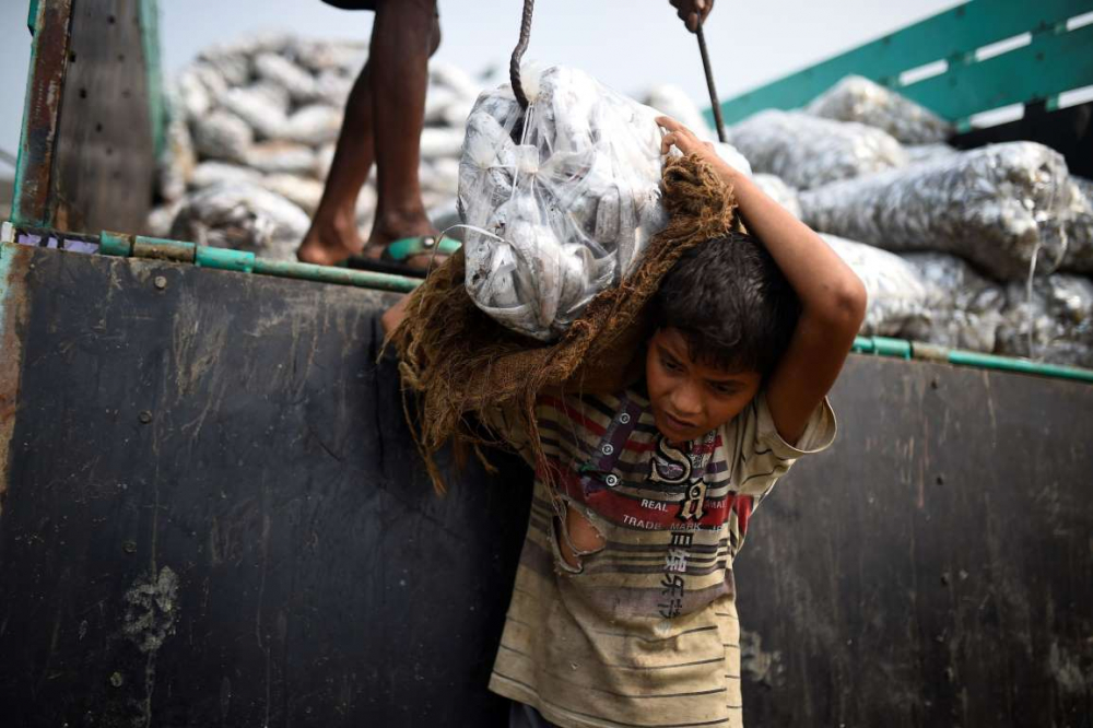 10 yaşındaki Rohingyalı Asma Akter, Nazirartek balık kurutma tesisinde, teslimat kamyonundan dondurulmuş balıkları sırtında taşıyor. Çocuklar çalışmak zorunda.