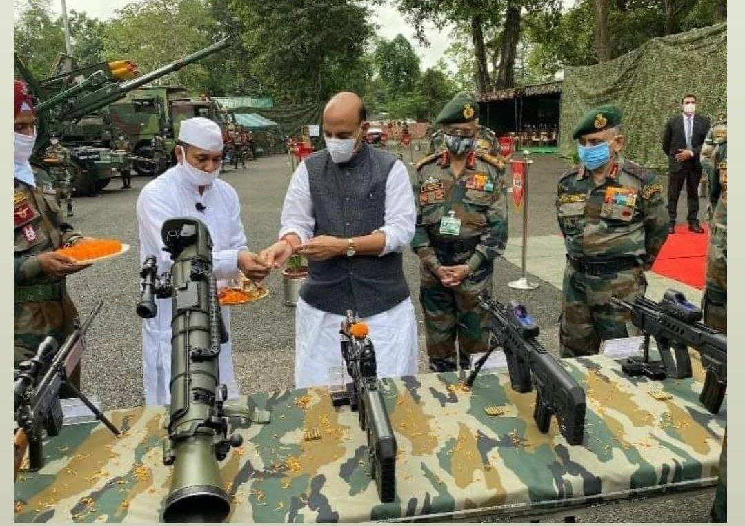 Hindistan Savunma Bakanı, üst düzey ordu komutanlarıyla beraber Shastra Puja yapıyor (Silah tanrılarına, kendilerine savaşta zafer vermesi adına bu silahlar için dua ediyorlar)