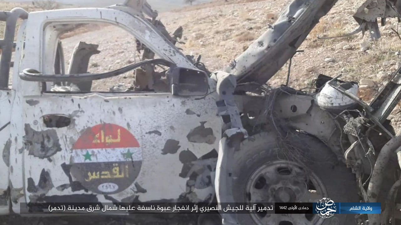 Son olarak IŞİD tarafından servis edilen görüntülerde ise, (Foto 1) Humus’un doğusundaki Palmira’nın (Tedmur) kuzeydoğusundaki bölgede Esed rejimine bağlı güçlere yönelik gerçekleştirilen el yapımı patlayıcı saldırısında hedef olan aracın görüntüleri paylaşılmış.