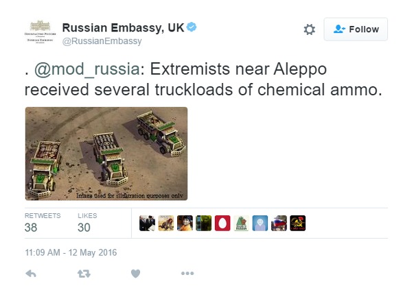 Tweet’te alay konusu olup Rusya’nın ölçüsüz propaganda makinesini gülünç duruma düşüren detay ise kullanılan resimdi. Suriyeli muhaliflerin kimyasal silahlara ulaştığı iddia edilen tweet'te, "Aşırılar Halep yakınında birkaç kimyasal silah kamyonu teslim aldı" deniliyor ve 2003 yılında ABD de geliştirilen bir bilgisayar oyununa ait resim kullanılıyordu. Oyun piyasaya sürüldüğü yıllarda çok popüler bir savaş strateji oyunu olan Command Conquer Generals adlı bir oyun.
