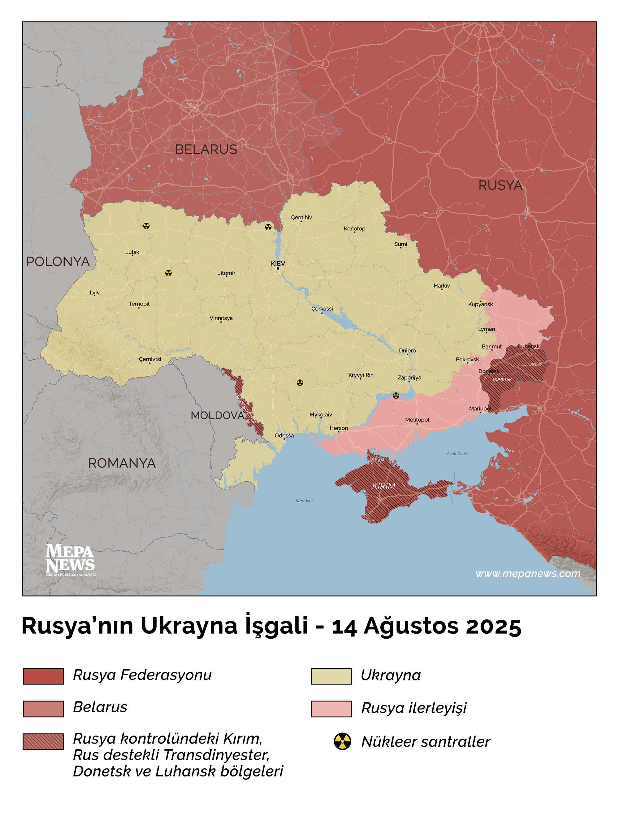 14 Ağustos 2025 itibarıyla Ukrayna'da tarafların yaklaşık kontrol durumu şu şekilde: