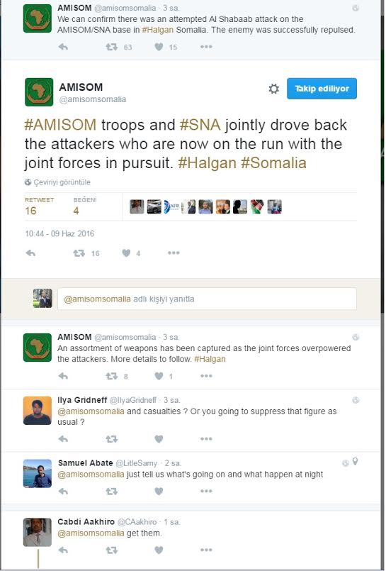 AMİSOM Resmi hesabından yapılan açıklamada Şebab'ın geri püskürtüldüğü yer alırken, sosyal medya üzerinden AMİSOM'a başarısızlığı nedeniyle tepki yağdı.