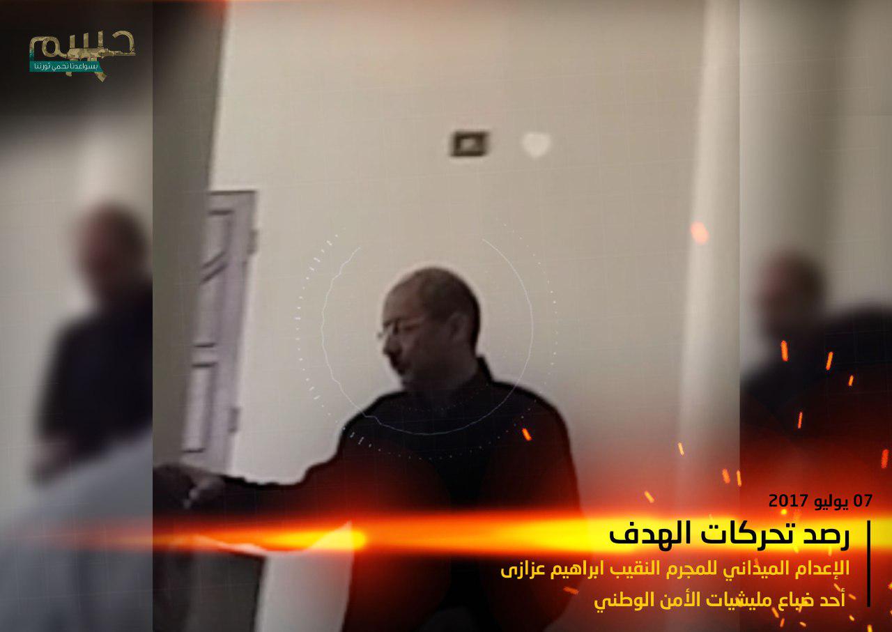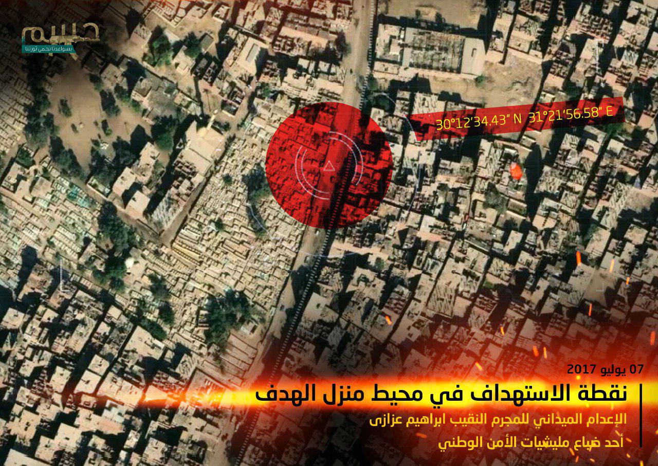 Grubun açıklamasında Sisi rejimi içerisinde oldukça aktif bir görevde bulunan İbrahim Azazi'nin ölümü 'meydan idamı' olarak nitelendirildi. Yapılan gözetleme ve takipten sonra Azazi'nin, evinin birkaç metre önünde kalbine ve başına sıkılan kurşunlar ile öldürüldüğü bilgisi de açıklamada yer alıyor. Grup açıklama ile birlikte, İbrahim Azazi'nin suikaste uğradığı yerin işaretlenmiş olduğu bir görsel de servis etti.