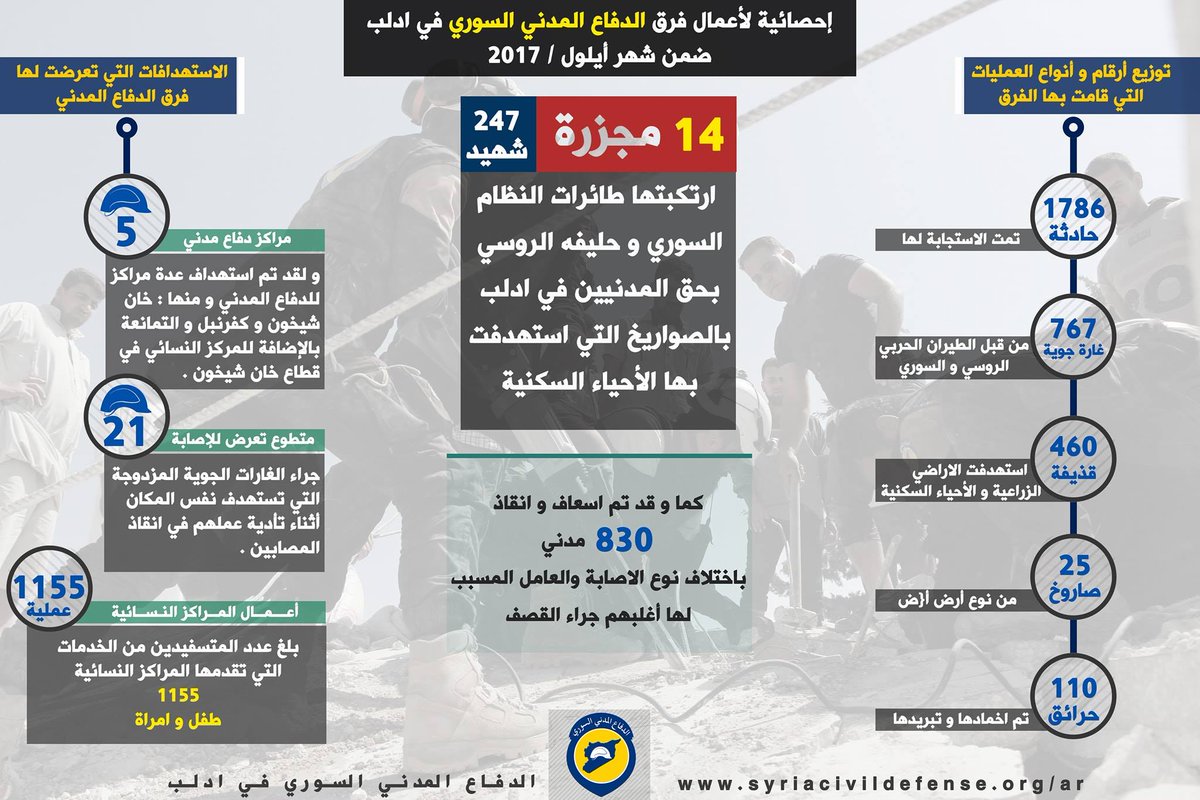 "Beyaz Baretliler" olarak da bilinen sivil savunma ekipleri Eylül ayı içinde binlerce olara müdahale ettiklerini açıkladığı bir grafiği de kamuoyu ile paylaştı. Paylaşılan grafikte Eylül ayında İdlib iline yönelik düzenlenen saldırılar ve ayrıntıları ile ilgili rakamlar yer alıyor.
