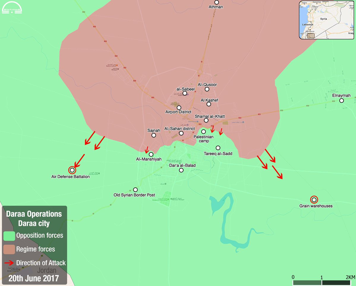 Dün öğlen saatlerinde şehrin güney kırsalında tanklarla saldırıya geçen rejim güçleri hava savunma üssünü ele geçirerek Ürdün sınırına erişti. Böylelikle Muhaliflerin Deraa ilindeki kontrol alanı ikiye bölünmüş oldu.