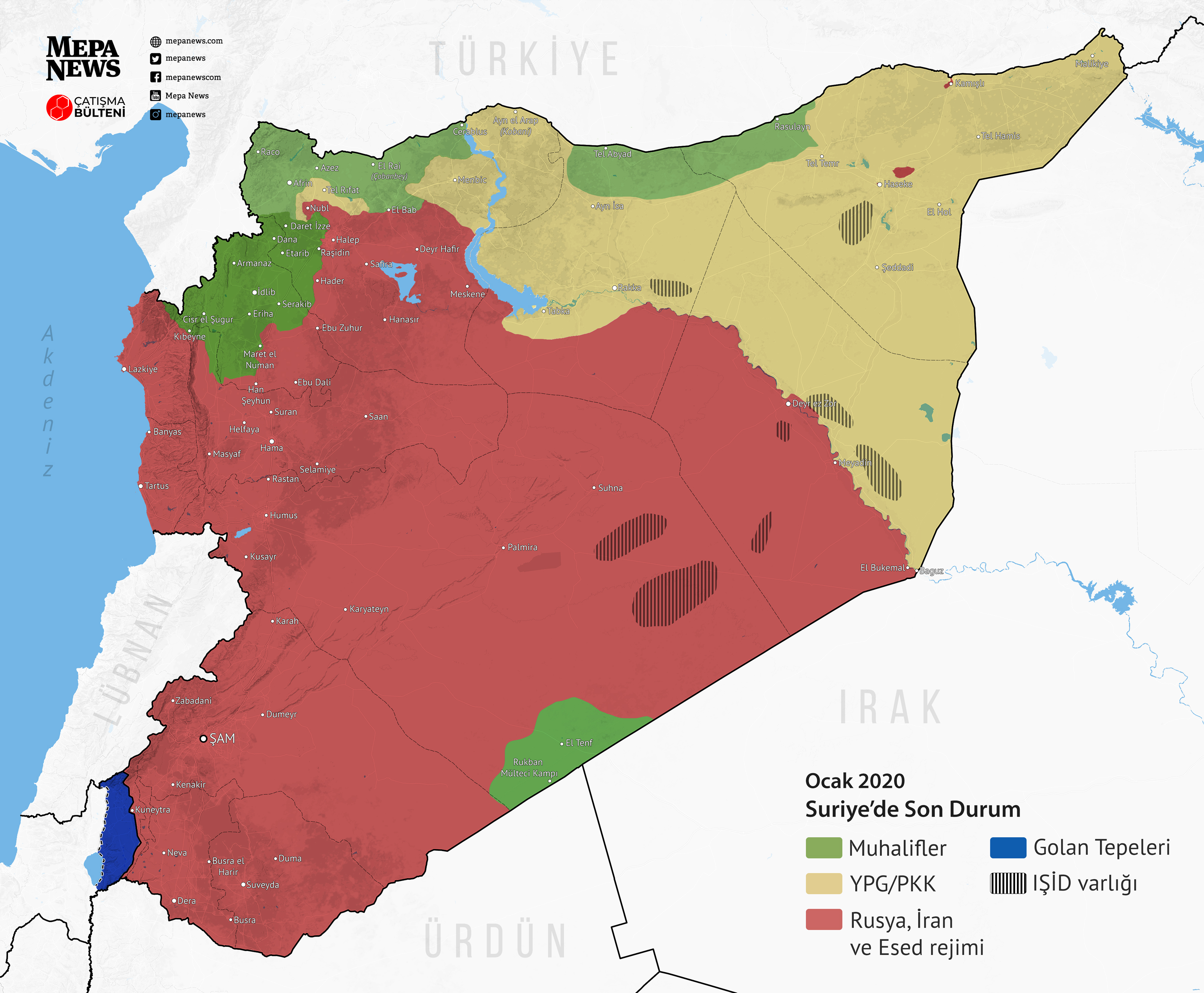 Suriye'de 2020 Ocak ayı itibariyle son durum ve kontrol alanları haritası.