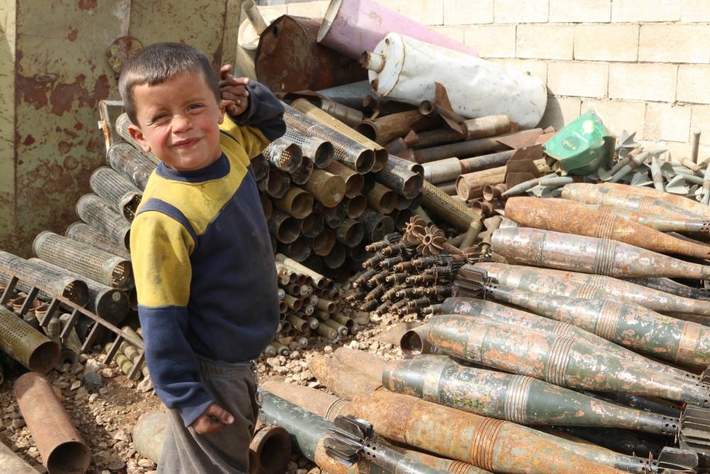 Şimdi muhaliflerin kontrolündeki İdlib ilinde yaşayan kırklı yaşlarındaki Suriyeli adam ve dört küçük çocuğu, parçalarını geri dönüştürmek için şarapnel ve patlamamış mermileri toplayarak geçimini sağlıyor.