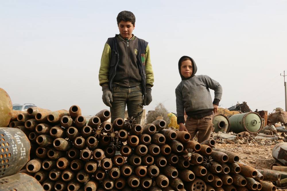 Şimdi muhaliflerin kontrolündeki İdlib ilinde yaşayan kırklı yaşlarındaki Suriyeli adam ve dört küçük çocuğu, parçalarını geri dönüştürmek için şarapnel ve patlamamış mermileri toplayarak geçimini sağlıyor.