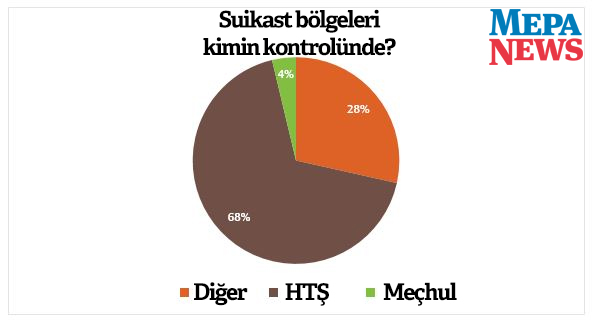 Üçüncü olarak, alınan bilgiler ışığında en fazla hedef alınan bölgelerin Tahriru'ş Şam Heyeti (HTŞ) grubunun kontrolü altındaki bölgeler olduğu görülüyor. Suikastlerin %68’i HTŞ grubunun baskın olduğu bölgelerde gerçekleşirken, %28’i diğer grupların (Tahrir Suriye, Feylaku'ş Şam gibi İslami tandanslı gruplar ve ÖSO) hakimiyet alanlarında meydana geliyor. Geriye kalan %4’lük oran bilgi eksikliği sebebiyle ayrıca sınıflandırılmıştır.(Grafik3)