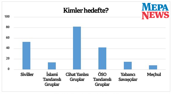 Dördüncü olarak, HTŞ Ocak-Temmuz ayları arasında en fazla hedef alınan grup oldu. Yapılan açıklamalar ve yayılan bilgiler göz önüne alınırsa cihat yanlısı gruplar arasından HTŞ grubuna mensup sivil, savaşçı ve din adamlarına karşı toplamda 82 suikast düzenlendi. Suikastlerden nasibini alan ikinci grup ise 53 saldırı ile siviller oldu. "Ilımlı" olarak nitelendirilen ÖSO gruplarına 42 suikast girişimi olurken, 15 saldırı ile yabancı savaçıları ihtiva eden gruplar hedef alındı. 14 suikast ise İslami tandanslı (Tahrir Suriye, Feylaku'ş Şam gibi) gruplara karşı düzenlendi. 8 suikast girişiminin ise hedefleri açık olmadığından ayrıca sınıflandırılmıştır.(Grafik4)