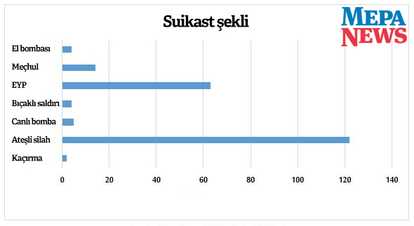 Beşinci olarak, yapılan saldırılarda en fazla kullanılan yöntem ateşli silah (120 defa) oldu. Saldırganlar uzmanlıklarına ve hedeflerinin tiplerine göre birçok suikast yöntemi kullandı. Kullanılan yöntemleri sırasıyla verecek olursak: Ateşli silah(120), el yapımı patlayıcı (62), canlı bomba saldırısı(3), bıçakla saldırı(2), el bombası(2) ve kaçırma(1). 14 saldırının ise hangi yöntem ile düzenlendiği konusunda bilgi sahibi değiliz. (Grafik5)