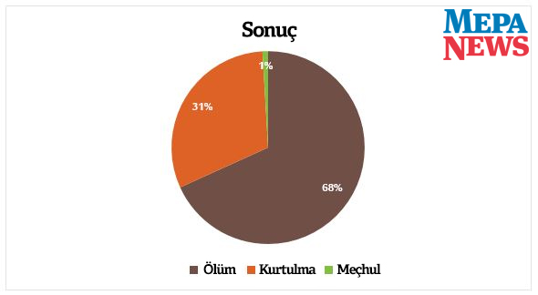 Altıncı olarak, yapılan suikast saldırılarının üçte biri başarısız oldu. Yine gözlem ve açıklamalar referans alınırsa gerçekleşen saldırılardan %68’inde muhtemel hedefler hayatını kaybederken %31’lik kısmı ise başarısız oldu. Geriye kalan %1’lik dilim malumat eksikliği sebebiyle bilinmiyor. (Grafik6)