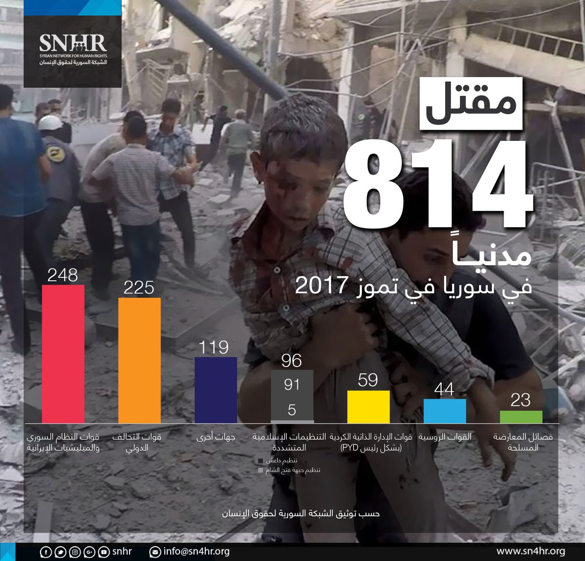 Suriye İnsan Hakları Gözlemevi (SNHR) tarafından yayınlanan rakamlara göre Suriye'de Temmuz ayı içinde 814 sivil yaşamını yitirdi.