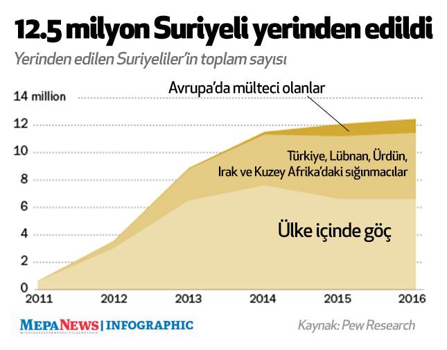 Tahminen 12.5 milyon Suriyeli yerlerinden edilmiştir ve bu sayı ülke nüfusunun yüzde 60'ına tekabül etmektedir.