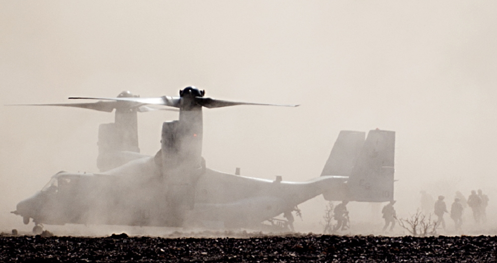 Cibuti'deki eğitim misyonunda bulunan ABD donanmasına bağlı askerler V-22 Osprey helikopterinden iniş yapıyor, Aralık 2001