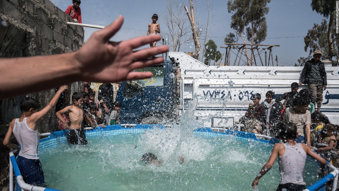 Çocuklar San’a’daki Harat el-Mesne’a mahallesinde içi su dolu bir havuzda oynuyor. Bölgedeki bir askeri üsse yakın olan mahalle, geçen sene Kurban Bayramı’nda iki hava saldırısıyla hedef alındı. Hava saldırılarında 25 ev kullanılamaz hale geldi.