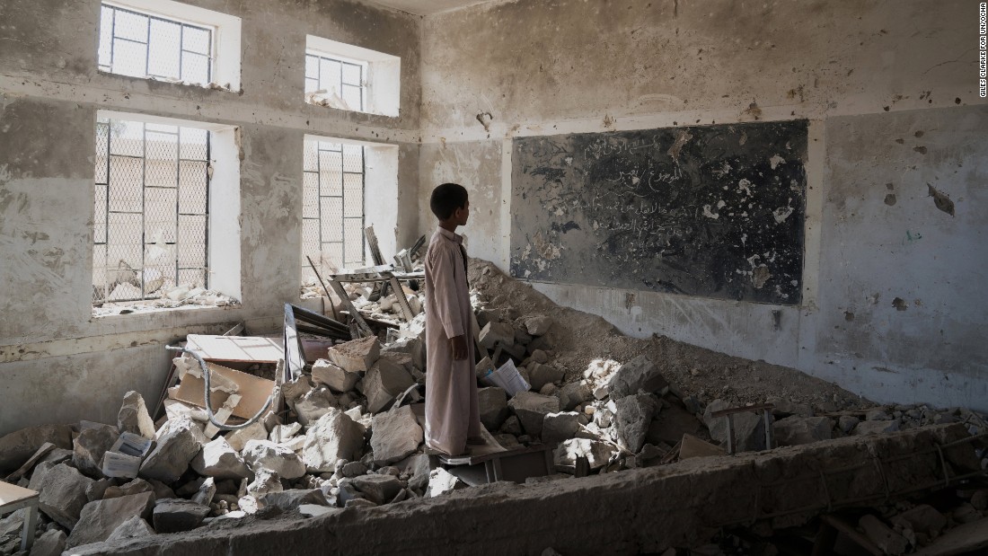Aal Ukab okulundaki bir öğrenci eski sınıflardan birinin enkazı içinde. O ve arkadaşları yakınlardaki UNICEF çadırlarında eğitim almaya çalışıyorlar.
