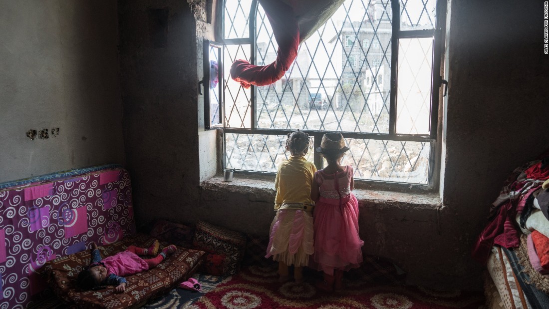 İbb şehrinin kenar mahallelerinden birinde çocuklar, eski hükümet binasının penceresinden dışarı bakıyor. Bina, yerel yetkililer tarafından evinen olmuş 53 aileye tahsis edildi. Ancak elektrik ve su yok.
