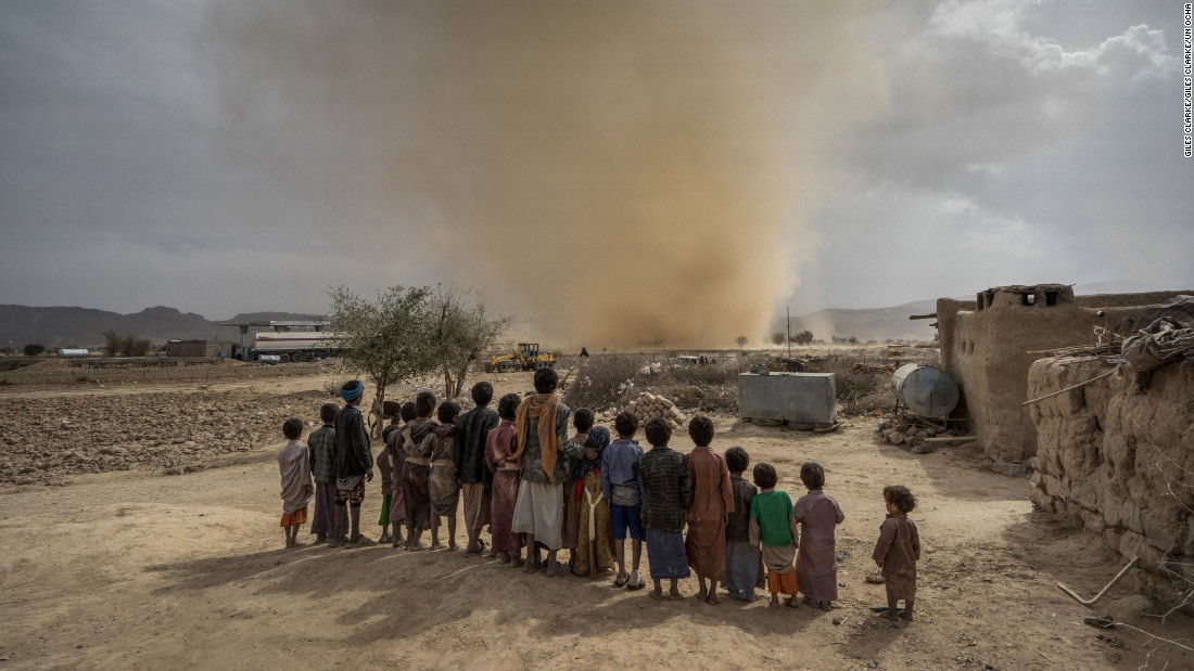 Çocuklar, başkent San’a’nın 80 kilometre kuzeyindeki Hus kasabası yakınlarındaki çölde bir kum fırtınasını izliyor. İnsani yardım organizasyonlarının öngördüğüne göre, yıl sonuna kadar ülkede tam bir kıtlık hakim olacak.