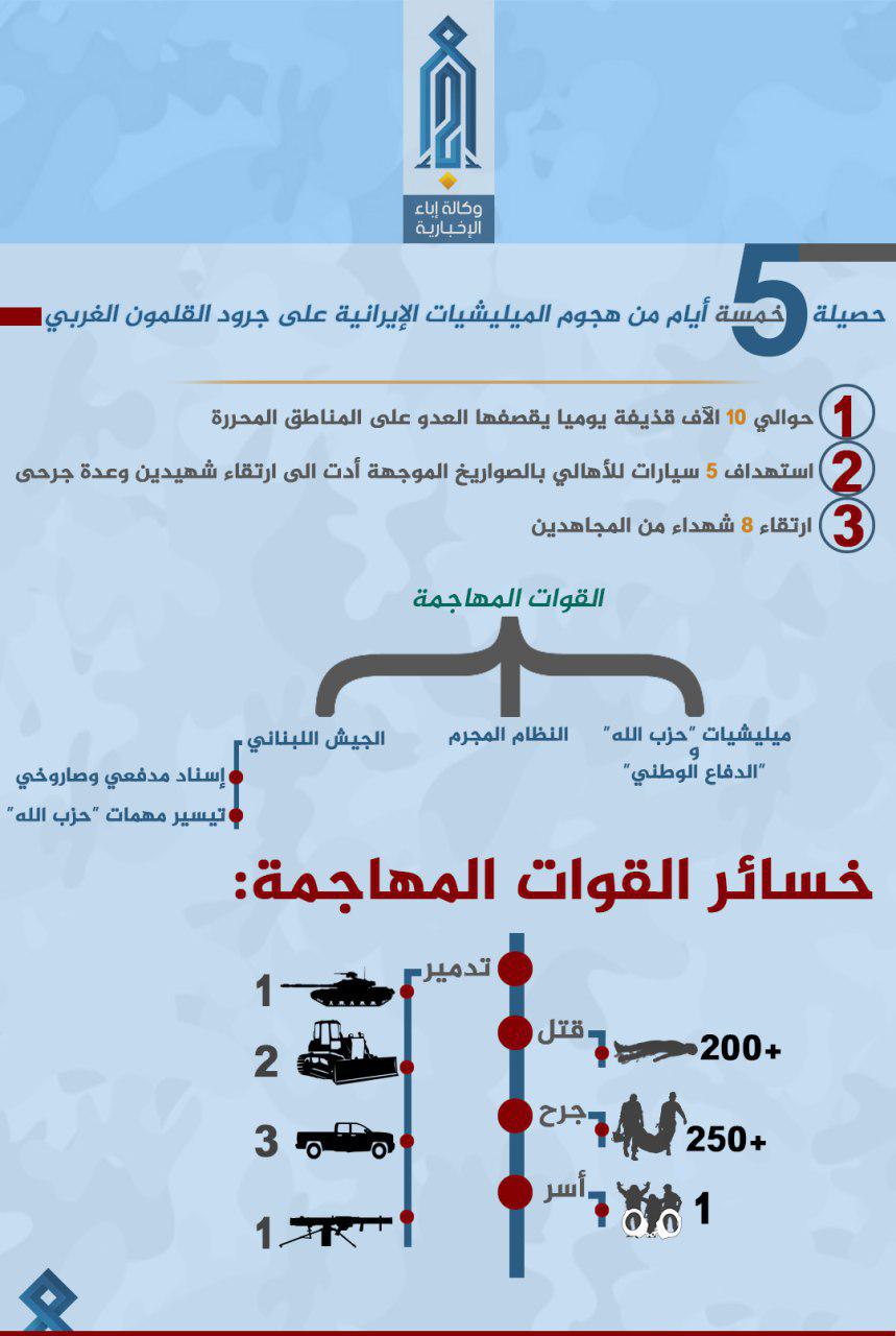 Tahriru'ş Şam kaynakları bölgede yaşanan çatışmalar ile ilgili 5 günlük süreci özetleyen bir infografik yayınladı. Bölgede Hizbullah milisleri ile yaşanan çatışmalara ait ayrıntıları medya organları üzerinden paylaşan grubun yayınladığı infografikte çarpıcı rakamlar yer alıyor.