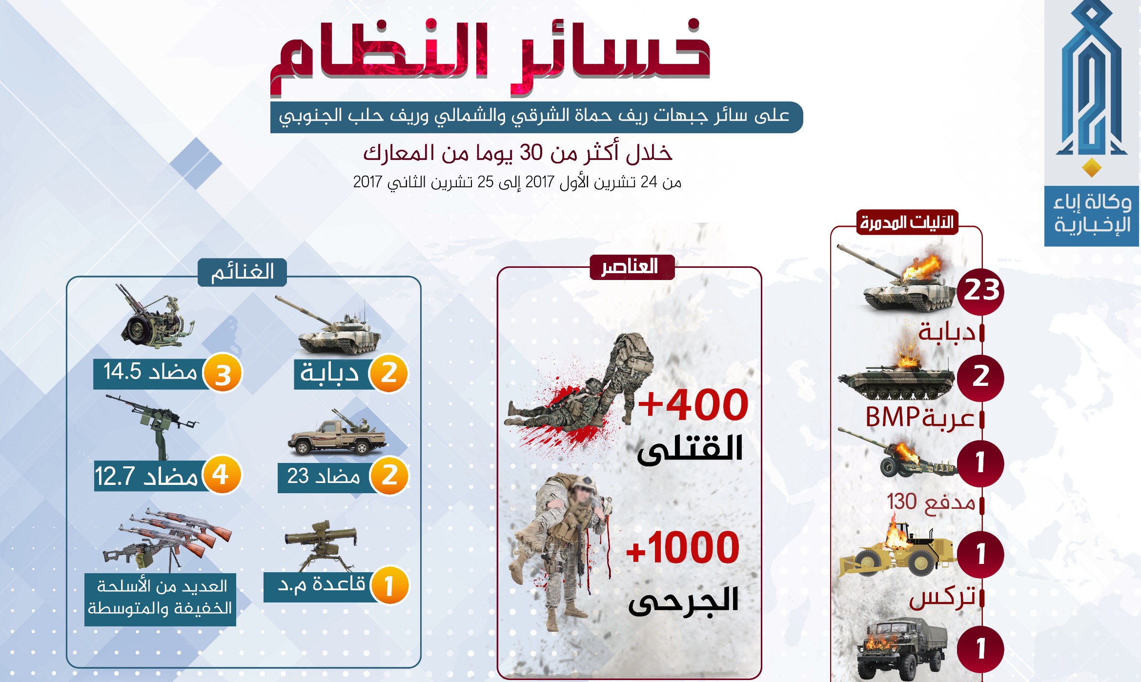 24 Ekim - 25 Kasım arasındaki tarihleri referans alan verilere göre Hama'nın kuzey ve doğu, Halep'in güney kırsalında gerçekleşen çatışma ve saldırılarda rejime bağlı güçlerden en az 400 kişi öldü, 1000'den fazla kişi de yaralandı.