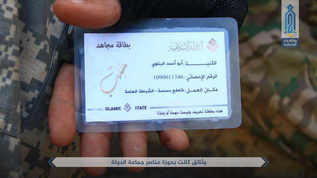 Bölgede IŞİD ile yaşanan çatışmalarda öldürülen bir IŞİD savaşçısının üzerinden çıkan "İslam Devleti"ne ait kimlik de muhalif grup tarafından yayınlanan görüntülerin içinde yer alıyor.