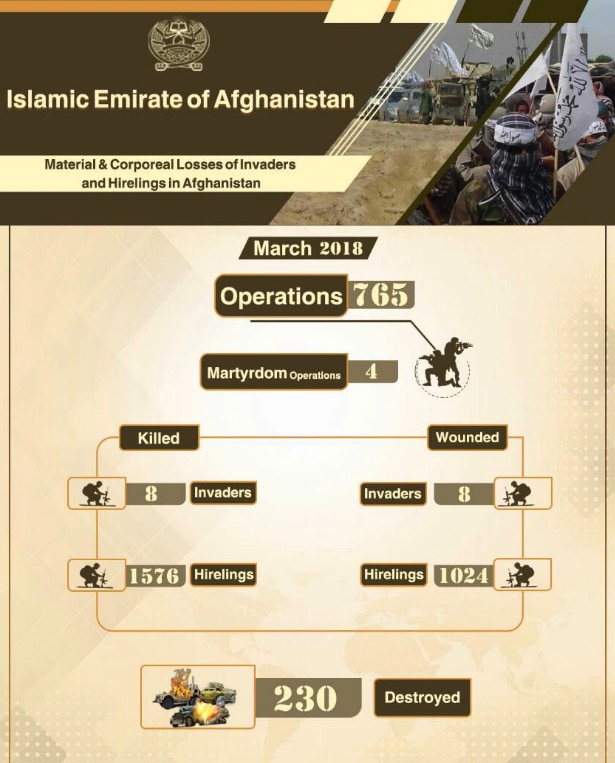 Taliban, sosyal medya ağları üzerinden servis ettiği yeni infografikte Mart ayında Afganistan'da yerli ve yabancı güçlere yönelik düzenlenen saldırılarla ilgili rakamlara yer verdi.