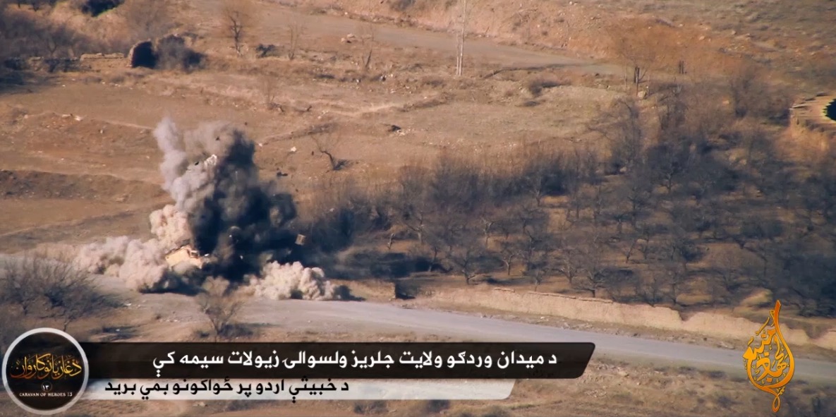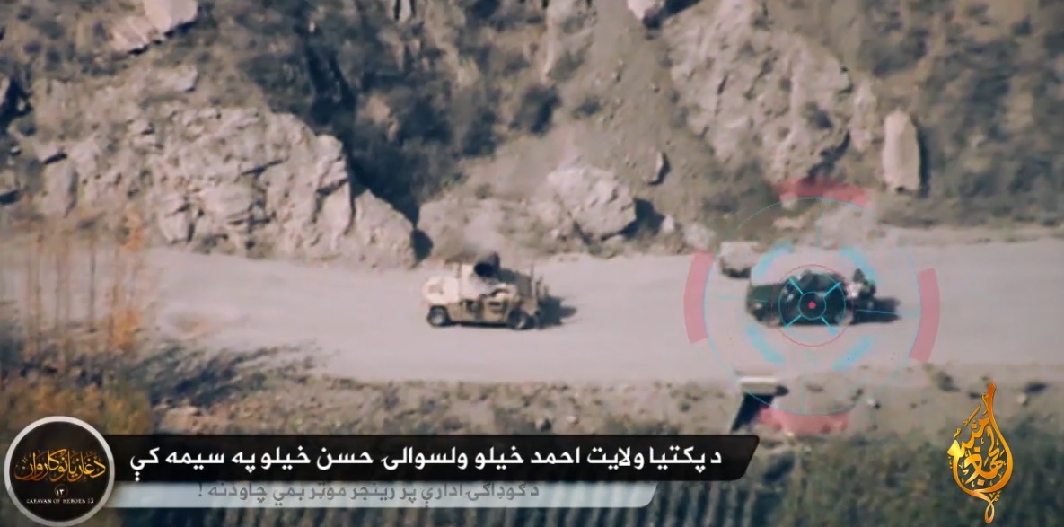 Görüntülerin devamında Kabil hükümeti güçlerine ait bir askeri konvoy ülkenin doğusundaki Paktiya iline bağlı Ahmed Hel bölgesinde ilerliyor. Taliban tarafından daha önce yola yerleştirilmiş olan patlayıcı araçların geçişi sırasında patlatılıyor.