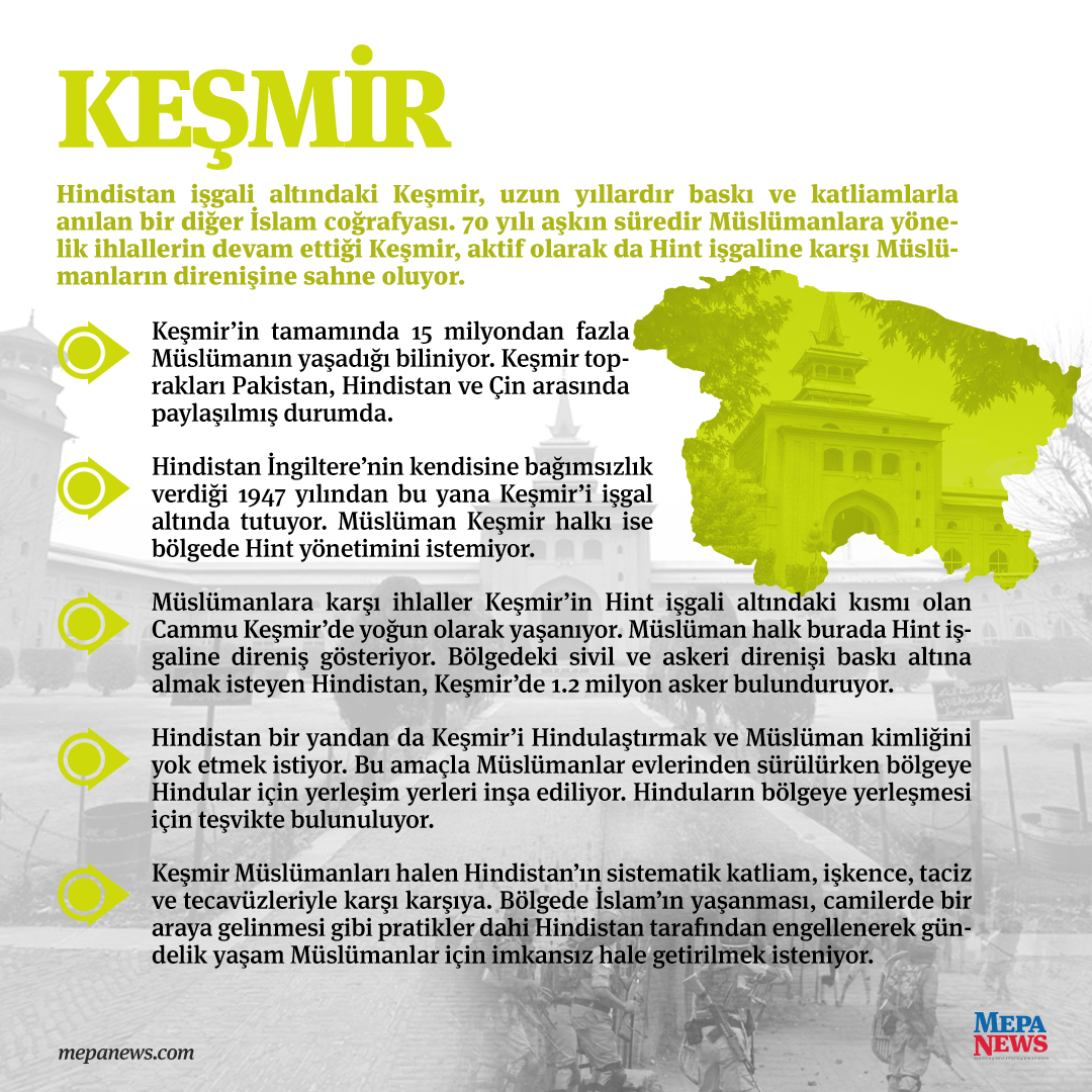 Hindistan işgali altındaki Keşmir, uzun yıllardır baskı ve katliamlarla anılan bir diğer İslam coğrafyası. 70 yılı aşkın süredir Müslümanlara yönelik ihlallerin devam ettiği Keşmir, aktif olarak da Hint işgaline karşı Müslümanların direnişine sahne oluyor.