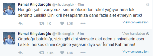 Kılıçdaroğlu Twitter sayfasında, "Laiklik her şeyden önce bir toplumsal barış ilkesidir. Toplumsal barışımıza çoktandır kastedenlerin bu ilkeyi yok saymasına şaşırmamalıyız!" diye yazdı ve ekledi: