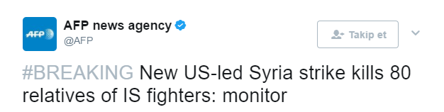 AFP Twitter hesabında yaptığı paylaşımda şu ifadeleri kullandı: "Suriye'de ABD öncülüğündeki yeni saldırı IŞİD savaşçılarının akrabalarından 80 kişiyi öldürdü: gözlemci" Söz konusu ifade sosyal medyada birçok kişinin tepkisini çekti. Kullanıcılar AFP'yi, ABD saldırılarında sivillerin öldürülmesini meşrulaştırmakla suçladı. Vurulan sivillerin "IŞİD mensuplarının akrabaları" olarak açıklanması tepki çekerken, Rakka'ya yönelik saldırı öncesi sivillerin bu denli rahat şekilde vurulması ve basının bunun meşru bir saldırı gibi paylaşması sivil kayıplarına yönelik endişeleri artırdı.