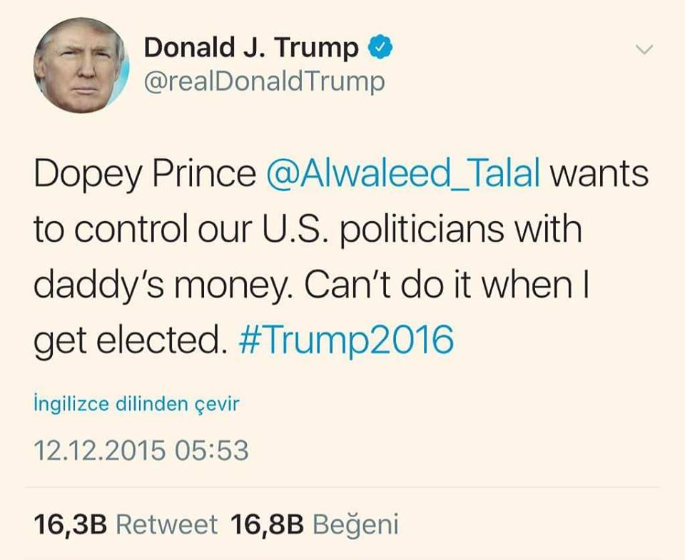 Trump ABD Başkanı olmadan önce attığı bir tweet'te, Suudi iş adamını durduracağını söylemişti.