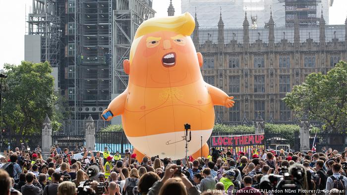 Eylemciler, Trump'ı kızgın turuncu bir bebek olarak tasvir eden dev bir balon da uçurdu. Yaklaşık altı metre boyundaki balonda, bebek bezi giydirilerek resmedilen Trump'ın elindeki cep telefonuyla da attığı saldırgan tweet'lere gönderme yapılıyor. Parlamento binası üzerinde de uçurulan balona, Trump karşıtı gösterilere destek veren Londra Belediye Sadiq Khan tarafından izin verilmişti.