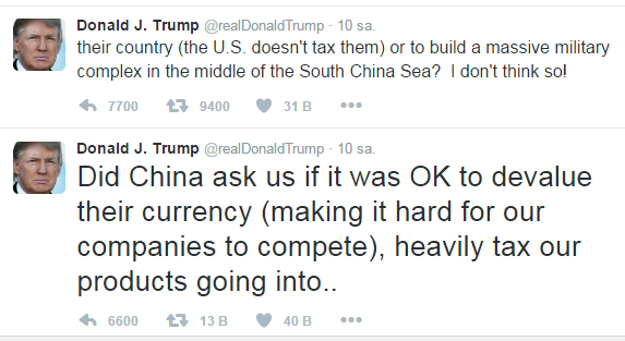 Trump Twitter üzerinden "Çin para biriminin değerini düşürüp ABD şirketlerinin rekabet gücünü kırarken, ürünlerimize yüksek vergi koyarken (ABD, Çin mallarından vergi almıyor) ya da Güney Çin Denizi'nin ortasına askeri üs inşa ederken bize sordu mu? Hiç sanmıyorum" mesajlarını paylaştı.
