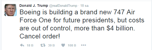 Trump, Twitter'da "Boeing gelecek ABD Başkanları için yeni bir 747 Air Froce One uçağı üretiyormuş, ama fiyatlar kontrolden çıkmış; 4 milyar dolardan fazla. Siparişi durdurun!" yazdı.