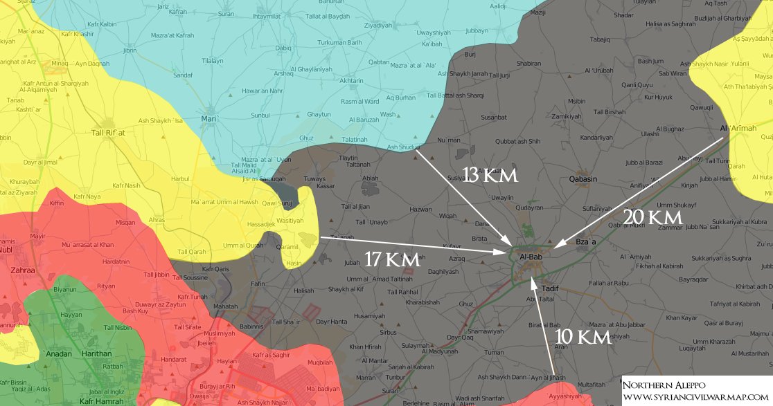 [Mavi: Fırat Kalkanı'na katılan muhalif güçler, Sarı: PYD/YPG, Siyah: IŞİD, Kırmızı: Suriye rejimi ve Şii milisler, Yeşil: Muhalifler)