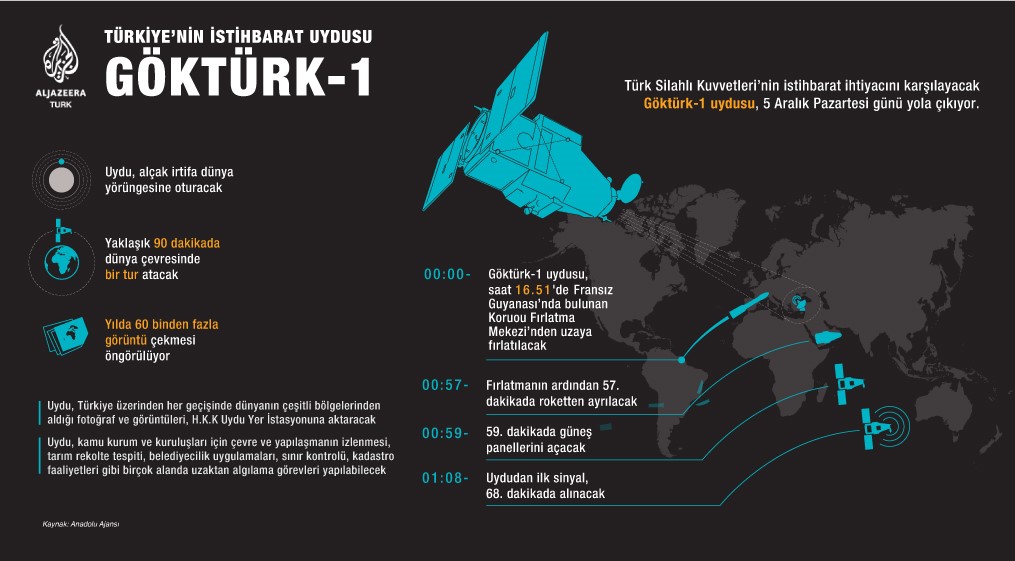 Türk Silahlı Kuvvetlerinin (TSK) hedef istihbaratına yönelik uydu görüntüsü ihtiyacını karşılayacak Göktürk-1 uydusu, yarın saat 16.51'de Fransız Guyanası'ndan fırlatılacak.