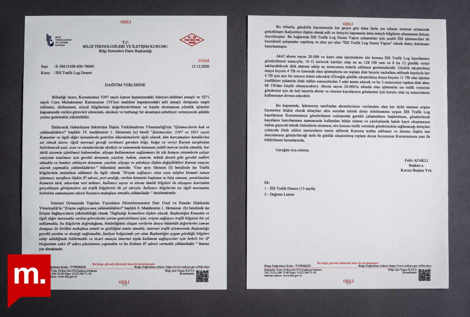 BTK’nın Türkiye’deki tüm kullanıcılara ait internet trafiğini talep ettiği, İSS Trafik Log Deseni başlıklı ve gizli ibareli yazı, 15 Aralık 2020’de internet servis sağlayıcısı şirketlere gönderildi.
