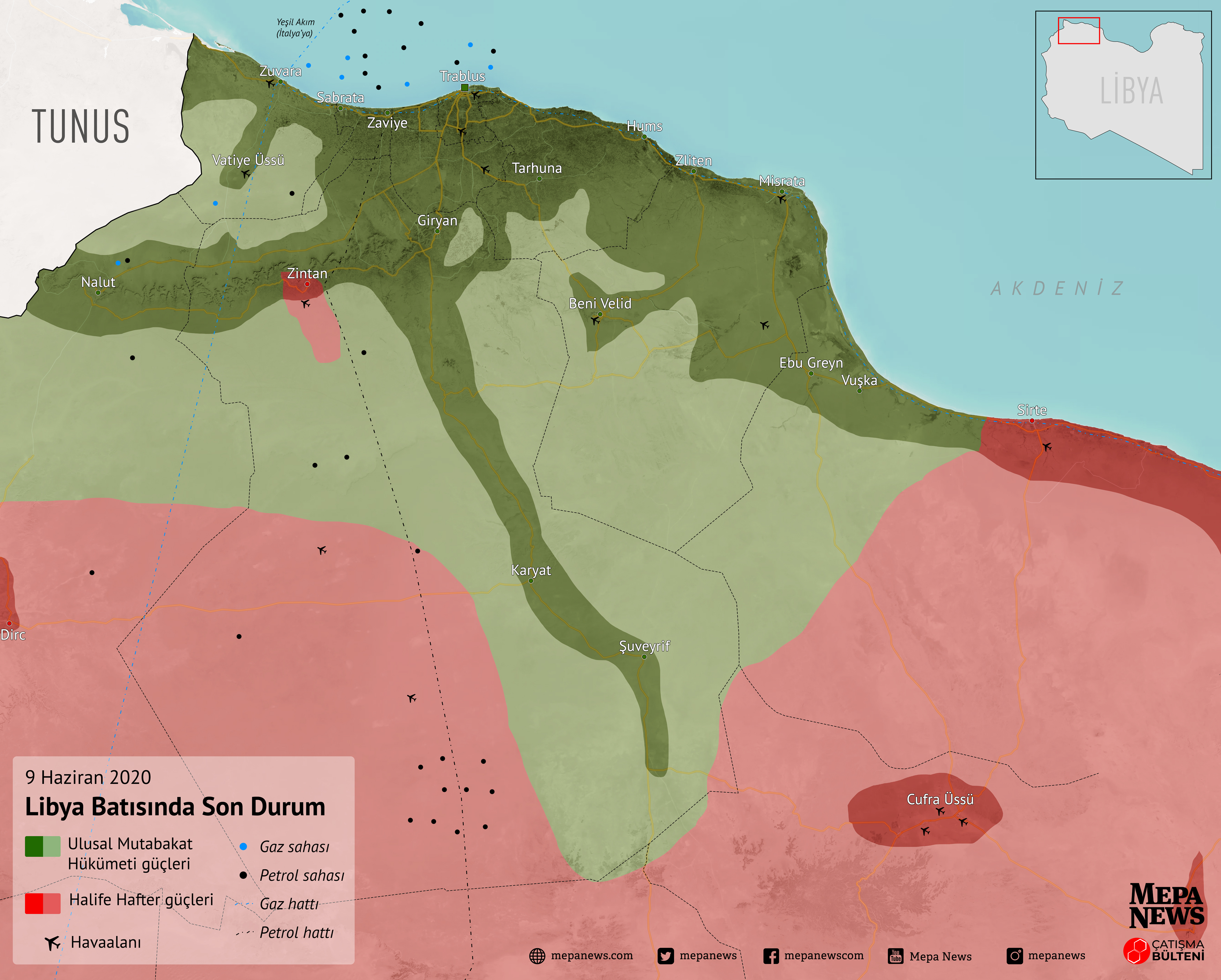 Türkiye'nin desteklediği Ulusal Mutabakat Hükümeti (UMH) güçlerinin Trablus eksenindeki kontrol altına alınan Tarhuna ve Beni Velid bölgelerinde halen bomba imha çalışmaları yürüttüğü biliniyor.