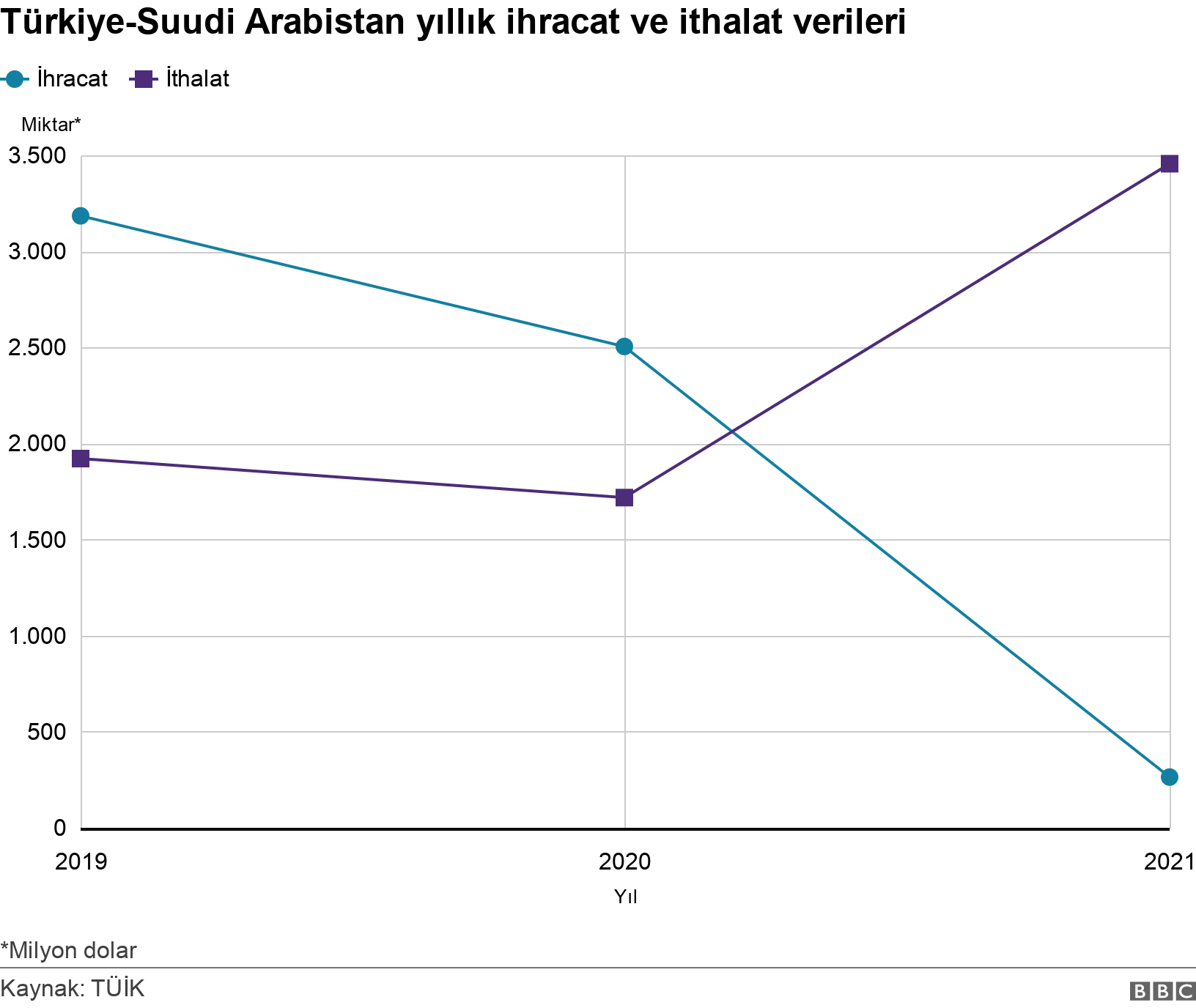 Buna göre 2022 Ocak ayında Türkiye'nin Suudi Arabistan'a ihracatı 9.528.000 dolar ve Şubat ayında 10.915.000 dolarken Mart ayında 61.430.000 dolara yükseldi. Yani ilişkilerinin seyrinin hızla düzeldiği Mart ayında ihracat rakamı bir öneki aya göre neredeyse altı katına çıktı.
